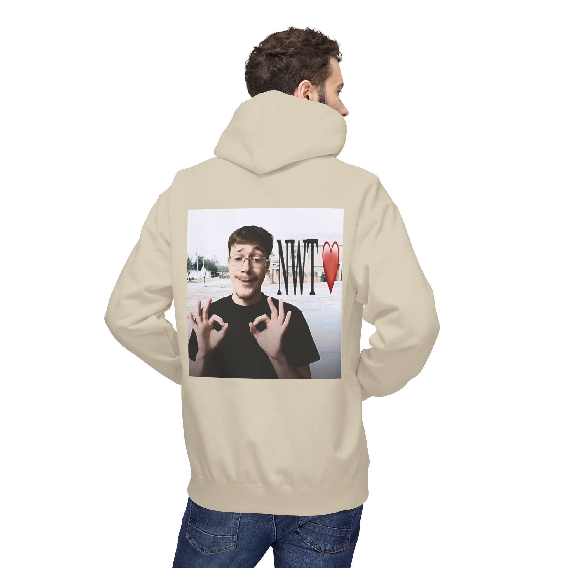 This midweight hoodie feels like a quiet inside joke you can wear. The front’s small, curved type whispers “NOW WE’RE TALKING,” while the back shows a candid photo—hands making an emphatic gesture beside a bold, slightly faded word and a red heart—giving the piece a low-key, internet-era charm. It settles warm and roomy over jeans or sweatpants, the dropped shoulders and pouch pocket making it a go-to for slow mornings, late-night chats, or road-trip playlists. Ethically made and soft against skin, it’s for people who like humor that’s private but loud enough for friends who get it.